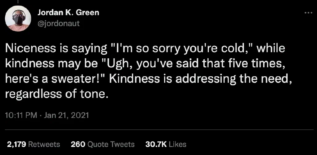 I was reading this article, and even though it is very focused on USA West vs. East coasts, it sparked some random thoughts. Being nice is not the same as being kind to yourself and your colleagues. Even if it is not the dictionary definitions of those words, I like this distinction.