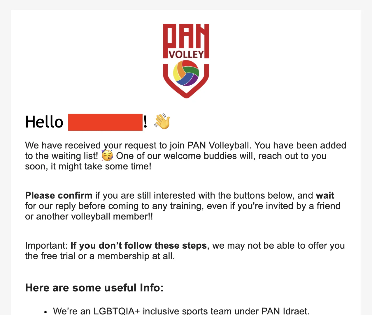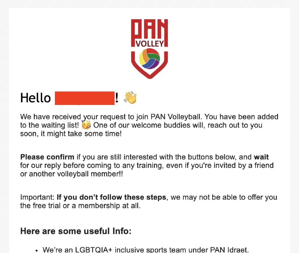 This confirmation step made a huge difference. As an LGBTQ+ club, some people decided not to continue once they realize the inclusive nature of the team. What if they could just click a link to say “sounds gay, I am in” instead of us sending follow up reminders? 😆