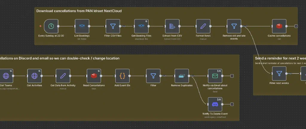 Now, n8n checks those same hall websites every week, compares the listings against our calendar, and alerts the person responsible in the steering group whenever we need to cancel a training. It’s a simple puppeteer cron job and a workflow that compares the data. It’s saved a huge amount of time and helped us avoid plenty of last-minute surprises.